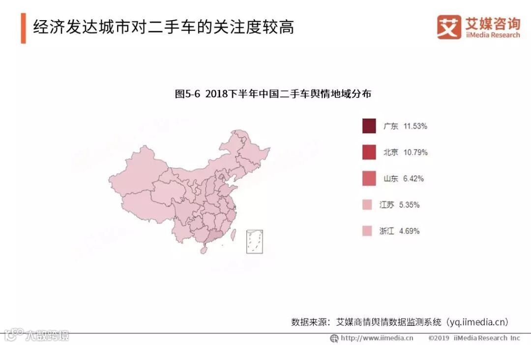 2018年下半年对二手车关注最高的五个地区分别是广东、北京、山东、江苏、浙江,占比分别为11.5%、10.8%、6.4%、5.4%、4.7%。