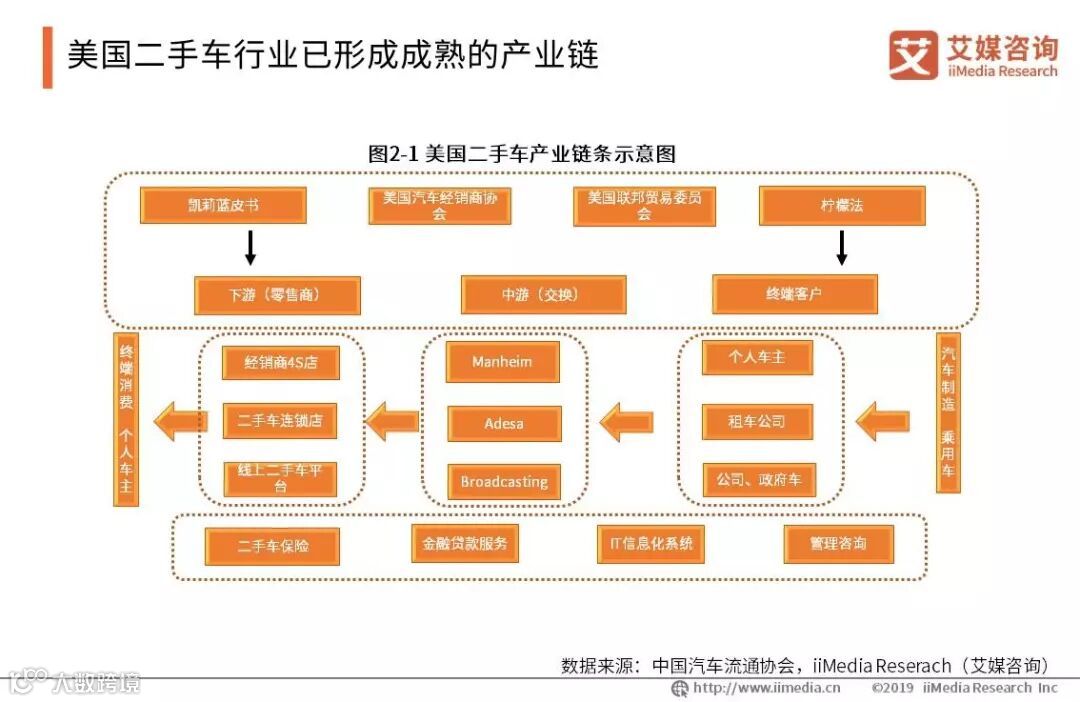 美国的二手车市场发展非常成熟,已经具有比较完善的二手车链条,上游有批量车源(Hertz),中间有拍卖公司(Manheim),下游有完善的不同模式零售商(Autonation/Carmax/ Beepi),围绕链条有报价的蓝皮书(Kelley Blue Book),有延保公司(美延),有金融公司(Dealertrack)等。