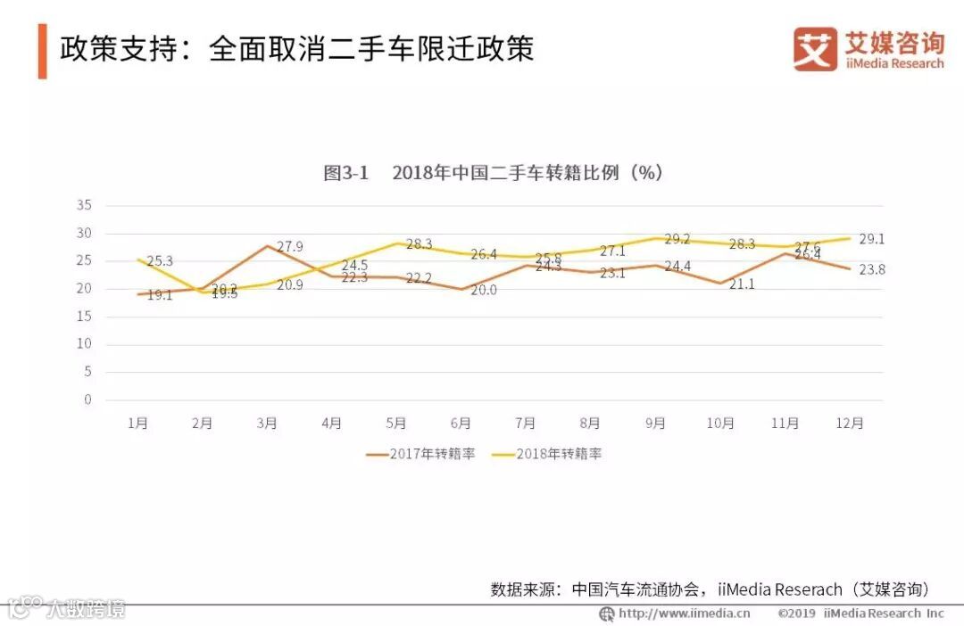 受益于全面取消二手车限迁政策,2018年中国二手车转籍总量为362.3万辆,转籍比例为26.2%,同比增加了4.4个百分点。艾媒咨询分析师认为取消二手车限制迁入,可以有效提高二手车流通率,提高二手车交易量,推动二手车行业的蓬勃发展。