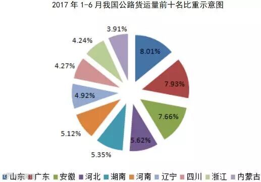 截至2017年6月,公路货运量排在前三的省份分别是山东、广东和安徽,占全国货运总量的比例分别为8.01%、7.93%和7.66%,其他占比较高的省份有河北、湖南、河南、辽宁、四川、浙江、内蒙古,前十个省份公路货物运输量占据了我国将近60%的份额,具体如下图所示。