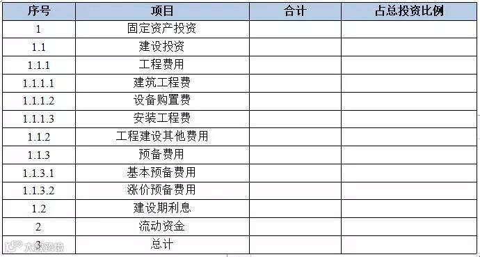 项目估算总投资(含流动资金)****万元,固定资产投资****万元。其中:建筑工程费****万元,设备购置费****万元,安装工程费****万元,工程建设其他费用****万元(含土地费用****万元),预备费****万元,流动资金****万元。项目所需资金全部来源于企业自筹。