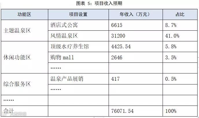 项目将建成融集健康养生、休闲度假、观光旅游、文化体验等四大功能于一体的温泉旅游项目综合体,包括山水风情温泉、酒店式度假公寓、休闲购物街、特色餐饮、温泉别墅、理疗养生馆、动植物生态观光园等服务项目。集中整合周边旅游资源,集温泉旅游、度假、会议接待、养生、休闲、娱乐、餐饮、购物、住宿等多元功能于一体的区域旅游集散地。