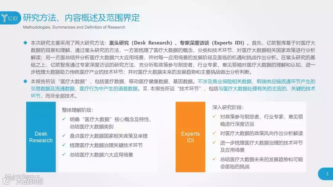 本报告主要采用桌面研究和专家访谈的研究方法,深入分析中国医疗大数据顶层设计思路,并对医疗大数据治理的技术环节及未来可能的主要应用场景进行了梳理,最后对医疗大数据未来的发展趋势做出了预判。