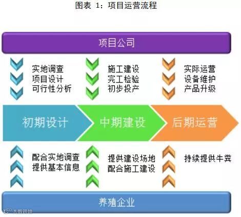 项目发起公司通过寻找投资伙伴,共同组建专门项目公司,负责对应项目从初期实地调查、项目设计、可行性分析,到中期项目施工建设、完工检验、初步投产、直至后期项目运营维护、产品升级等全过程内容。合作养殖企业不再参与项目具体运营管理过程,仅需承担提供项目建设场地,以及在项目运营过程中持续提供牛粪原材料的义务。