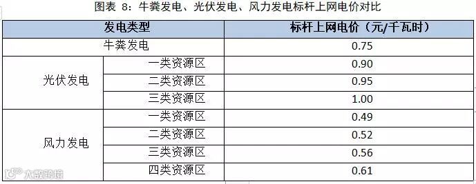 三类项目上网电价中,以光伏发电最高,牛粪发电居中,风力发电最低。