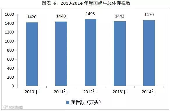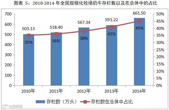 我国近年来乳业牧场总体发展趋势朝着规模化、集中化发展,在全国奶牛存栏数基本保持不变的情况下,规模化奶牛场(存栏数100头以上)奶牛存栏数不断增加,从2010年的503.13万头增加至2014年的661.50万头,占比从2010年的35%增加至2014年的45%,规模化程度不断提高。