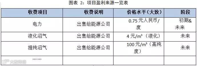 根据本项目发展阶段的不同,本项目盈利来源也有所不同。项目初期,项目主要收入来源仅为沼气发电获得的电力收入。在项目运营一段时期后,根据实际情况将新增液化沼气、提纯沼气、氮磷钾复合肥和碳排放交易的盈利内容。
