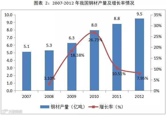 2012年1-12月,我国钢材的产量达9.51亿吨,同比增长7.95%。2012年12月份,我国生产钢材8137.47万吨,同比增长13.52%。