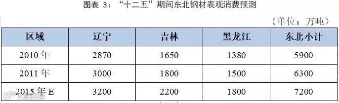 综上,考虑到“十二五”期间我国经济发展方式的转变带来的影响,结合东北经济的发展前景,特别是考虑到东北地区的城市化率和工业化程度,预测“十二五”期间东北区域钢材消费仍稳中有升但增速将有所放缓,总体低于全国平均水平。