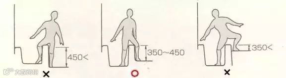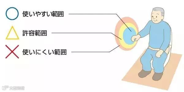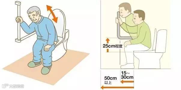 大家都知道起身的时候:手撑着的力气需要支撑整个身体,而由顺手处的扶手拉的过程则省力许多(可以自己做个试验),所以扶手的位置应设定在离马桶15~30mm的墙壁上。