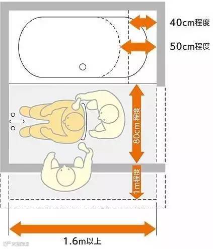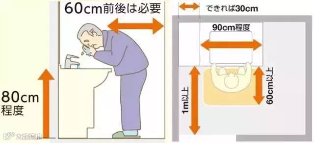 淋浴空间宽度至少设定在80cm以上,这样才能容纳轮椅或者淋浴椅时的空间;当老人需要介护者从后面帮忙洗浴的时候,所需宽度需控制在1米以上, 深度需在1.6米以上。