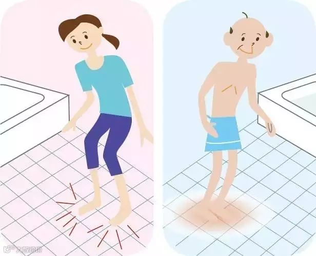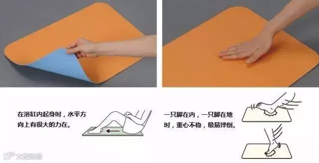 为浴缸内外安置防滑垫,老人不注意地移动,容易滑倒、或摔倒。