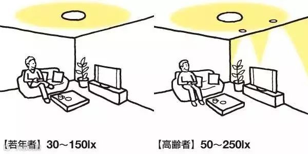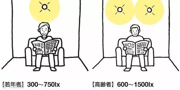 读字的照明,老龄人需亮度600~1500lx(年轻人的两倍左右)。