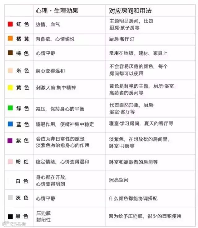 根据颜色的不同,房间的感官和心情得以变化。运用这些用途,优化色彩组合,能够最大限度地利用颜色效果,来创造老人舒适的住宅环境。如何搭配及运用这些色彩则是靠设计师下功夫了,不做风格讨论:比如「米色」是最接近皮肤色及剥开树皮里的木肌色,最易使人感觉放松,所以很多布类沙发、榻榻米则多用于此。所以尽量少用黯淡色,另外地毯的使用也是能提升空间温度感。