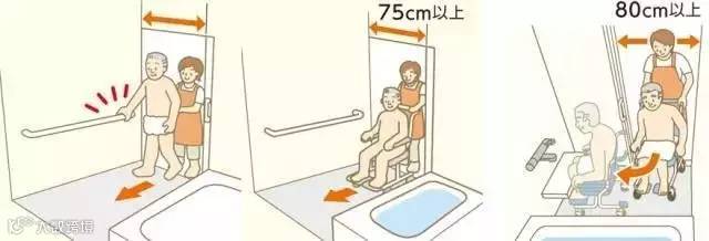 直接进入浴室时,需75cm以上;当进入需迂回时,门开尺寸至少80cm以上(洗浴过道容身处亦大于80cm);进入浴室路上应没有障碍。