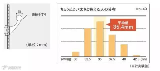 假如选择圆形扶手,最人性化的直径为:35mm,扶手直径太宽难以把握,相反直径太细给人不安的感觉,根据调查采样评价结果,圆形扶手以35mm为最适宜设计。