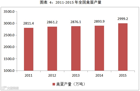 2015年我国蛋鸡存栏增加,且鸡龄结构以青壮年鸡为主,产蛋能力较强,全年鸡蛋产量继续增长。芝华数据显示,2015年末蛋鸡存栏14.34亿只,比上年末增长8.4%。其中,产蛋鸡存栏11.83亿只,比上年末增长4.8%;适龄开产中蛋鸡比重提高至67.7%,比上年末提高7.4个百分点。国家统计数据显示,2015年禽蛋产量明显增长,达2999万吨,比上年增长3.6%,增幅提高3个百分点。