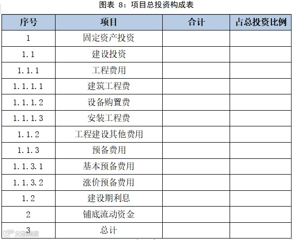 项目总投资为工程费用、工程建设其他费用、预备费、建设期利息以及流动资金之和,总计为***万元,其中:工程费用***万元、工程建设其他费用150.86万元、预备费用***万元以及铺底流动资金***万元。