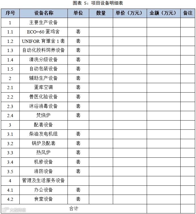 项目占地面积***亩,规划建筑面积***平方米,其中鸡蛋生产车间(钢构鸡舍)***平方米,仓储、蛋品包装、消毒等辅助生产用房(标准工业厂房)***平方米,其他用房***平方米。购置进口养殖设备***台,分别为层叠式蛋鸡笼***台,育雏笼***台,用于蛋鸡和雏鸡的养殖。
