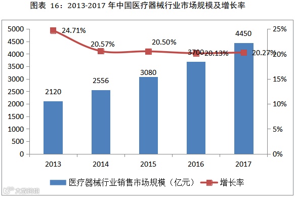 我国是人口大国,医疗器械行业属于国家重点支持的战略新兴产业,发展前景广阔。伴随着经济的快速发展,我国医疗器械行业增长迅速。我国医疗器械行业销售市场规模由2011年的1470亿元增长到2017年的4450亿元,同比增长20.27%,我国医疗器械行业正处于快速发展期。
