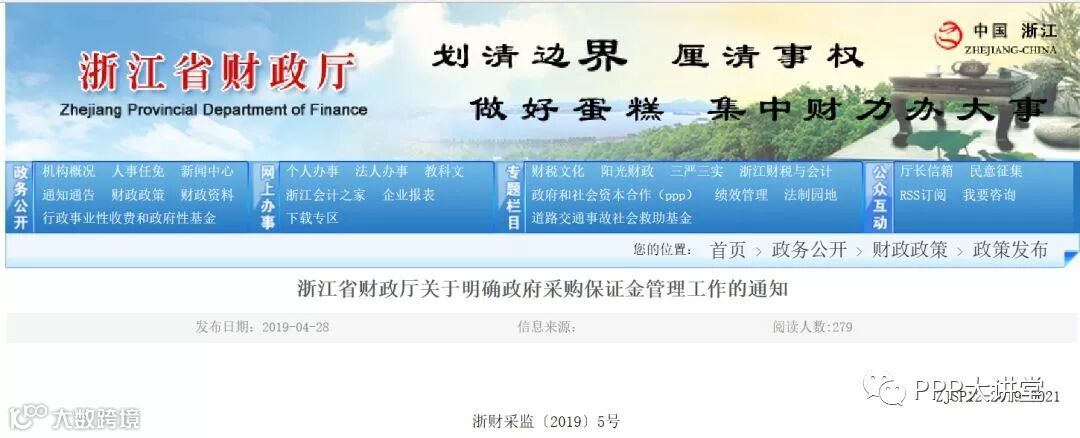 2019年4月28日浙江省财政厅官网发布《关于明确政府采购保证金管理工作的通知》,通知明确:自2019年6月1日起,全省政府采购货物和服务招标投标活动不得向供应商收取投标保证金,非招标采购方式采购货物、工程和服务亦同。