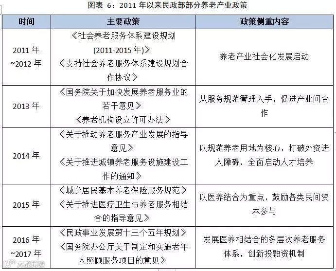 纵观近几年养老产业政策,主要围绕“人”(养老服务业人力缺口大)、“财”(产业投资资金从何来)、“物”(以用地为核心)三类资源。并以此为中心,围绕“如何优化资源配置和提高资源使用效率”做文章。与养老相关的机构间协同与合作成为优化资源提高效率改善效果的关键。总体来看,每年出台的产业政策各有侧重。