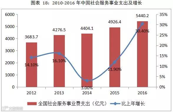 根据民政部发布的《2016年社会服务发展统计公报》,公报显示,截至2016年底,全国共有社会服务机构和设施174.5万个,职工总数1239.3万人;2006-2016年,全国社会服务事业费支出由915.4亿元增加到了2016年的5440.2亿元,11年间增加了4524.8亿元。各类养老服务机构和设施14.0万个,比上年增长20.7 %,各类养老床位合计730.2万张,比上年增长8.6%。由此可见国家对于养老产业的投入不断上升。
