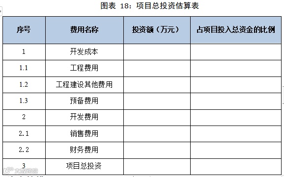 本项目投资总额为****万元。其中,土地费用****万元,工程费用****万元,工程建设其他费****万元,预备费****万元,销售费用****万元,财务费用****万元。