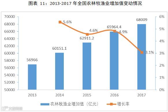根据农业部统计数据显示,2017年农林牧渔业增加值68009亿元,同比增长3.1%,比上年加快0.6个百分点。分业看,农业、林业和畜牧业增加值增长加快,渔业和农林牧渔服务业增加值增速回落。2017年农业、林业和畜牧业增加值增速分别为4.6%、6.6%和2.3%,比上年分别加快0.9、0.8和0.9个百分点;渔业增加值增速为2.6%,比上年慢1.4个百分点;农林牧渔服务业增加值继续保持较快增长速度,达到7.9%,但比上年有所回落,慢0.4个百分点。