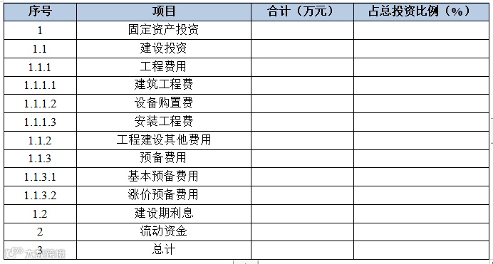 本项目总投资*****万元,其中,建筑工程费*****万元,设备购置费*****万元,安装工程费****万元,工程建设其他费用*****万元,预备费用****万元,流动资金为****万元。