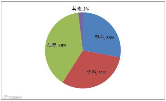 从全球有机颜料市场销售份额来区分,塑料行业占28%,涂料行业占31%,油墨行业占39%,其他行业占2%。