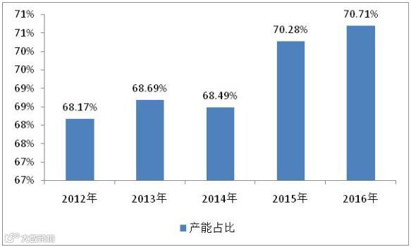 全国有机颜料前十五家产能2010年27万吨,2011年28.3万吨,2012年30.4万吨,2013年32万吨,2014年34万吨,2015年37万吨,2016年34.5万吨。企业平均生产能力维持在1.8-2.5万吨/家。从产能占比来看,截止2016年,前十五家企业的产能已经占据中国有机颜料产能的70.71%,达到2010年后的最高值,行业集中度在不断提升。