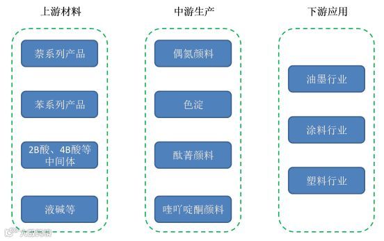 颜料行业上游原材料主要包括萘、苯系列产品、液碱等化工原料,下游应用行业主要为油墨、涂料和塑料行业。其中本项目产品主要是作为印刷油墨的核心原材料。