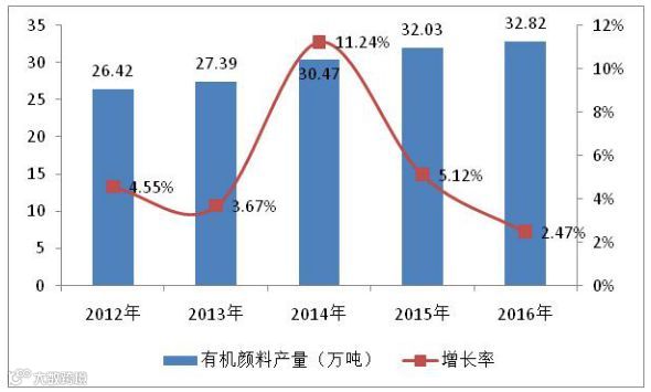 经过调整转型,有机颜料业正积极向高端化、国家化发展,加强技术创新和新产品研发,提高产品的盈利能力。2014年,我国有机颜料产量突破30万吨,2016年有机颜料产量达到32.82万吨,呈现出平稳增长态势。