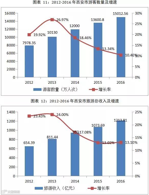 西安市2016年全市生产总值(GDP)6257.18亿元,同比增长8.5%;其中实现旅游收入1213.81亿元,同比增长13.1%,旅游业总收入相当于全市GDP的18.48%;全年共接待旅游人数15012.56万人次,比上年增长13.1%。