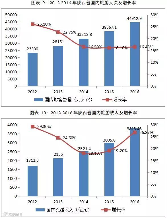 2016年,陕西省旅游业以“全域旅游”为抓手,深入实施“2336”发展思路,加快供给侧结构性改革。2016年全省接待境内外游客44912.92万人次,同比增长16.45%,旅游总收入3813.43亿元,同比增长26.87%。其中,接待入境旅游人数338.2万人次,同比增长15.41%,国际旅游收入23.38亿美元,同比增长16.91%;接待国内旅游人数44574.72万人次,同比增长16.46%,国内旅游收入3658.92亿元,同比增长26%。旅游收入增长高于旅游人数增幅10.42个百分点,国际、国内旅游市场呈现出良好的发展势头,旅游业进一步呈现出质量效益型增长态势,转型发展取得明显成效。