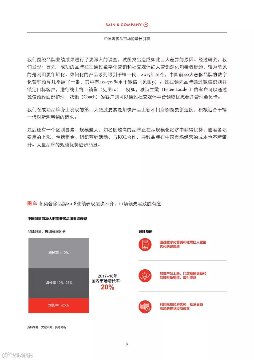 研究指出,尽管中国奢侈品市场整体上保持强劲增长,但对奢侈品牌来说,不同品牌之间差异巨大。随着收入的不断增长,中国消费者在奢侈品消费上的支出越来越高,同时,他们的口味也变得更加挑剔。成功的奢侈品牌更善于抓住和迎合消费者需求,因此导致不同品牌之间的业绩出现两极分化。