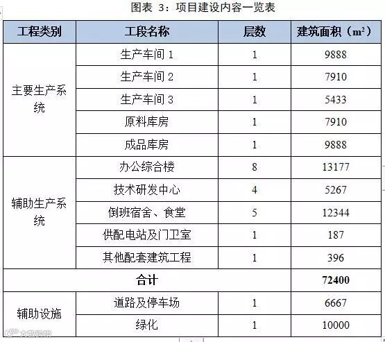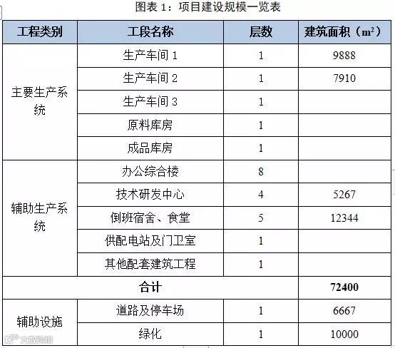 本期项目规划总占地100亩,总建筑面积72400平方米,建设内容主要为生产车间、原料库房、成品库房、办公综合楼、技术研发中心、倒班宿舍、食堂、供配电站及门卫室、其他配套建筑等内容,具体建设内容指标如下: