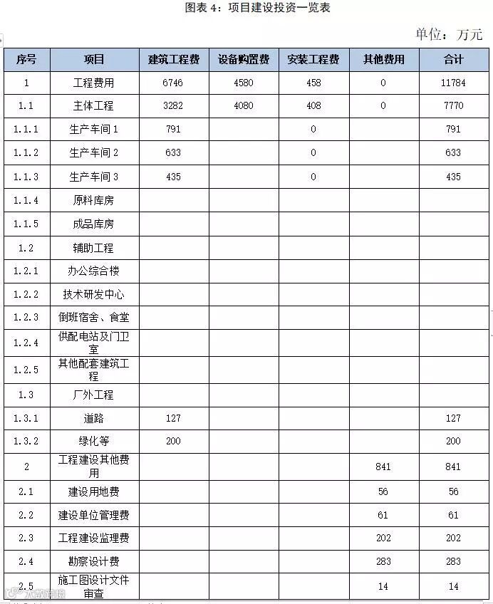 项目估算总投资(含流动资金)15000万元,其中:建筑工程费6746万元;设备购置费4580万元;安装工程费458万元;工程其它费用合计841万元;工程预备费628万元,铺底流动资金1433万元。