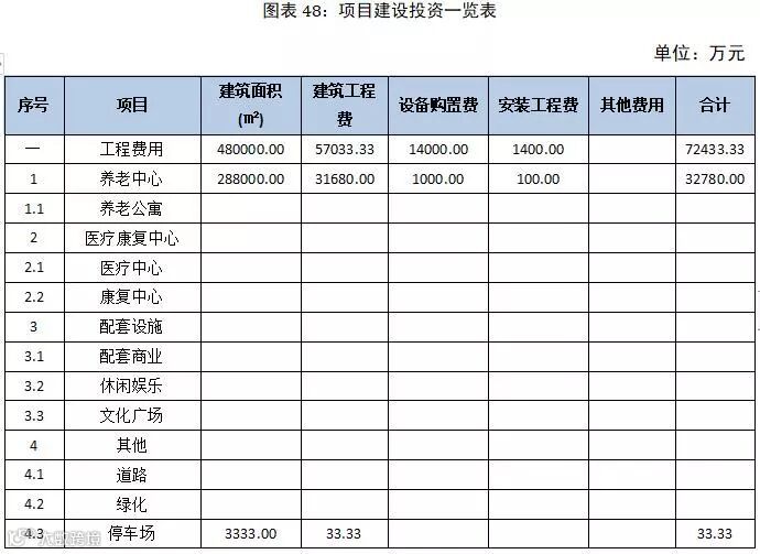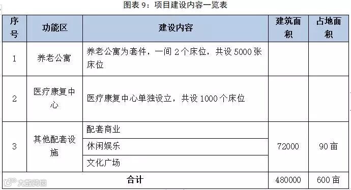 项目规划建设分为养老公寓、医疗康复中心及其他配套区域,总占地面积约为600亩。其中,养老公寓占地面积360亩,医疗康复中心占地面积150亩,其他配套设施90亩。项目具体建设内容与建设面积见下表: