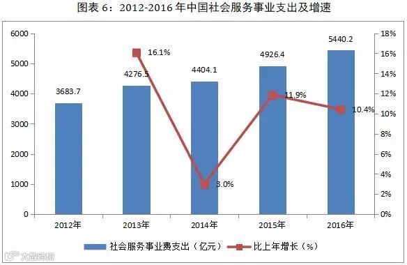 根据民政部2017年发布的《2016年社会服务发展统计公报》,截至2016年底,全国社会服务事业费支出5440.2亿元,比上年增长10.4%,占国家财政支出比重为3.4%,其中用于老龄服务体系建设的费用有明显增长。
