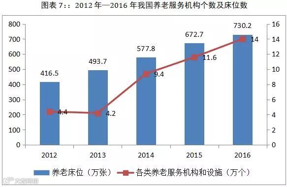 2016年,全国各类养老服务机构和设施14.0万个,比上年增长20.7%,其中:注册登记的养老服务机构2.9万个,社区养老服务机构和设施3.5万个,社区互助型养老设施7.6万个;各类养老床位合计730.2万张,比上年增长8.6%(每千名老年人拥有养老床位31.6张,比上年增长4.3%);其中社区留宿和日间照料床位322.9万张。