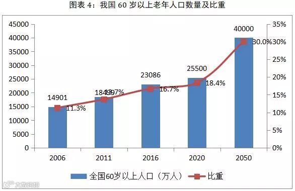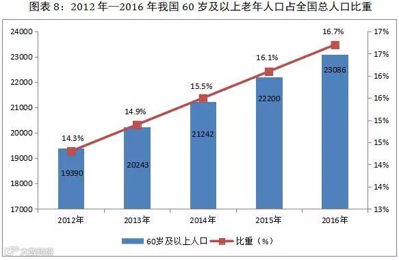 20世纪90年代以来,我国经济迅速发展,人民的生活水平和医疗卫生条件不断改善,人均寿命不断提高,老年人的绝对数和相对比例均增加,我国人口的年龄结构已由成年型转向老年型,并于1999年进入老龄化社会。根据国家统计局数据,截至2016年底,全国60岁及以上老年人口23086万人,占总人口的16.7%,其中65岁及以上人口15003万人,占总人口的10.8%。
