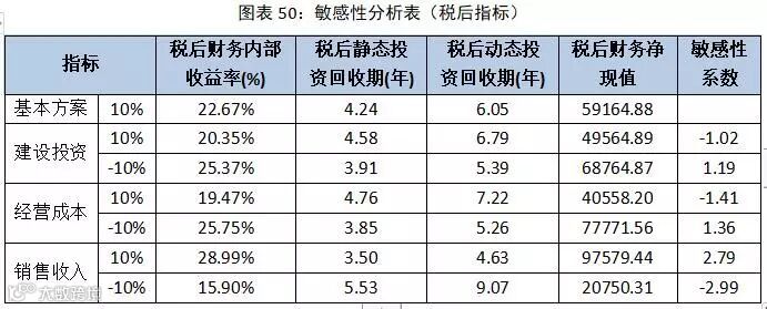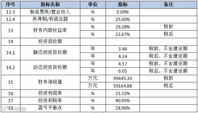 该项目所得税前的财务内部收益率为29.28%,所得税后财务内部收益率为22.67%,均高于行业基准收益率,总投资收益率为31.32%,满足投资者的要求。投资动态回收期(税前)为4.57年,投资动态回收期(税后)为6.05年,低于基准投资回收期,说明项目的盈利能力较好。