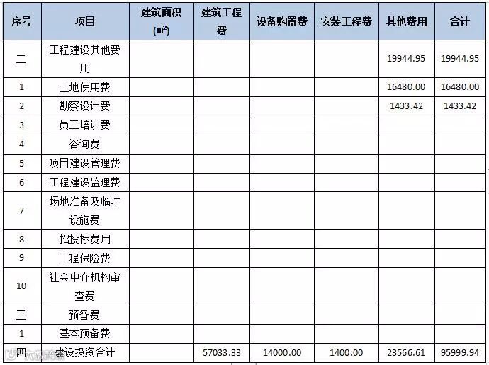 项目建设投资费用为95999.94万元,其中工程费用为72433.33万元,工程建设其他费用为19944.95万元,预备费为3621.67万元,具体如下表所示: