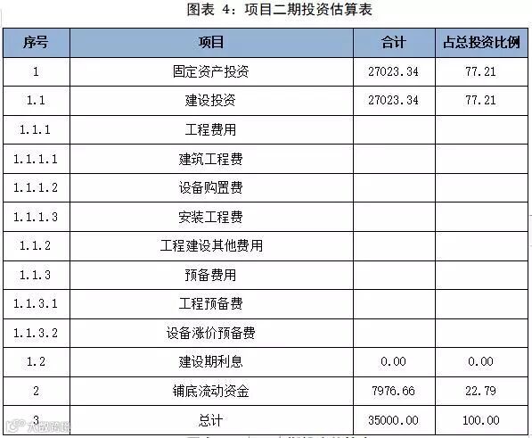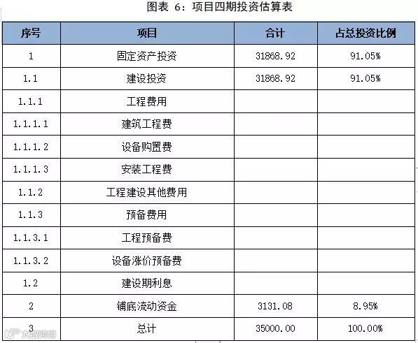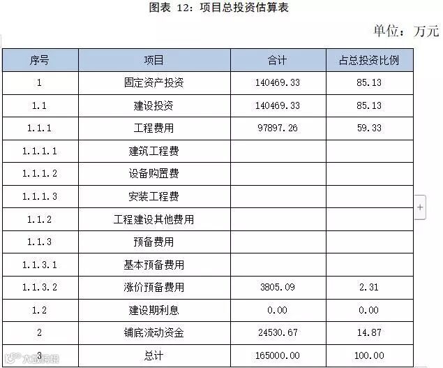 项目估算总投资(含流动资金)165000.00万元,其中一期投资70000万元,二期投资35000万元,三期投资25000万元,四期投资35000万元,具体如下: