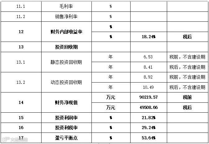 根据损益表,现金流量表,项目所得税后净现值内部收益率测算表,可进一步测算出动态反映本项目盈利能力的净现值NPV、内部收益率IRR、项目动态全部投资回收期Rt和投资利润率等指标。