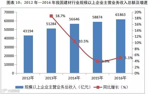 截止2016年底,我国建材行业规模以上企业达到35113家,与上年相比增加1133家。其中,规模以上企业实现主营业务收入61863亿元,同比增长5.4%,与上年相比提升2.6个百分点,高于全国工业增速0.5个百分点。