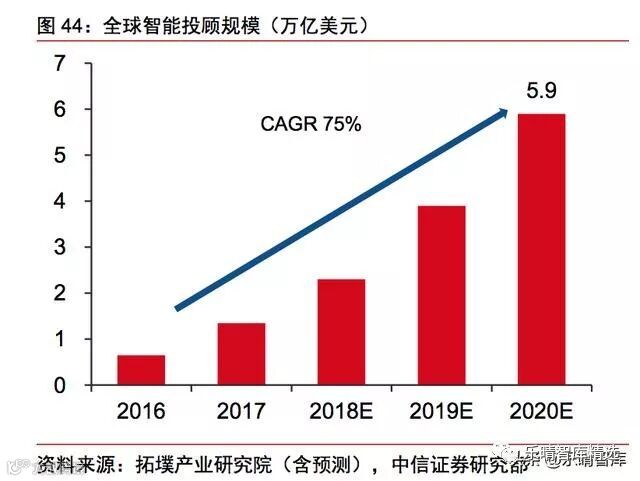 据拓墣产业研究预测,全球智能投顾规模在2020年达到5.9万亿美元(CAGR+75%);