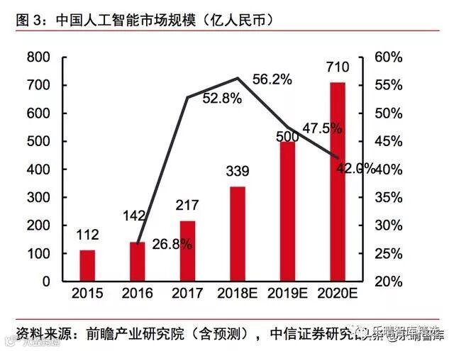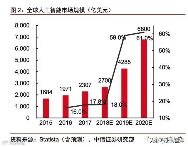 Statista预计2019、2020年,全球人工智能市场规模将分别增长59%、61%,成长至6800亿美元量级。